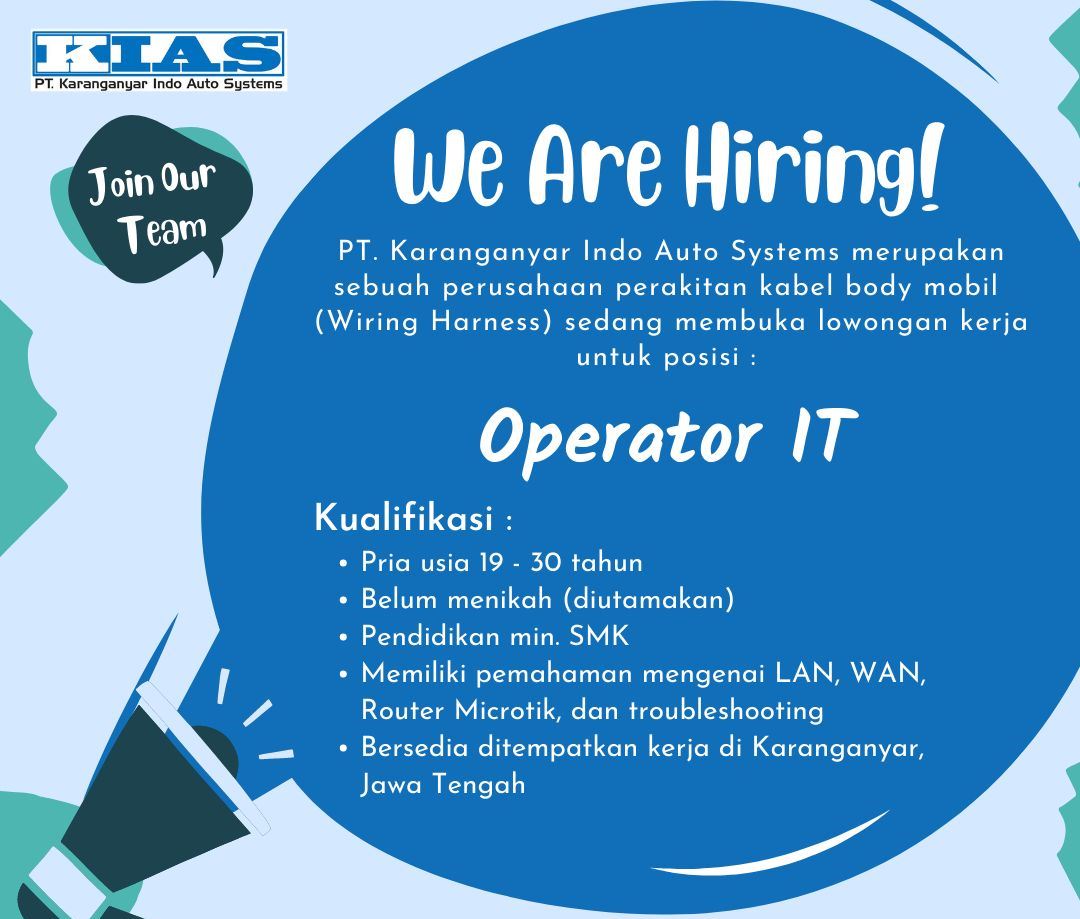 PT. Karanganyar Indo Auto Systems (KIAS) adalah sebuah Perusahaan Perakitan Kabel Body Mobil (Wiring Harness) di Jaten – Karanganyar membuka Lowongan Kerja untuk posisi: