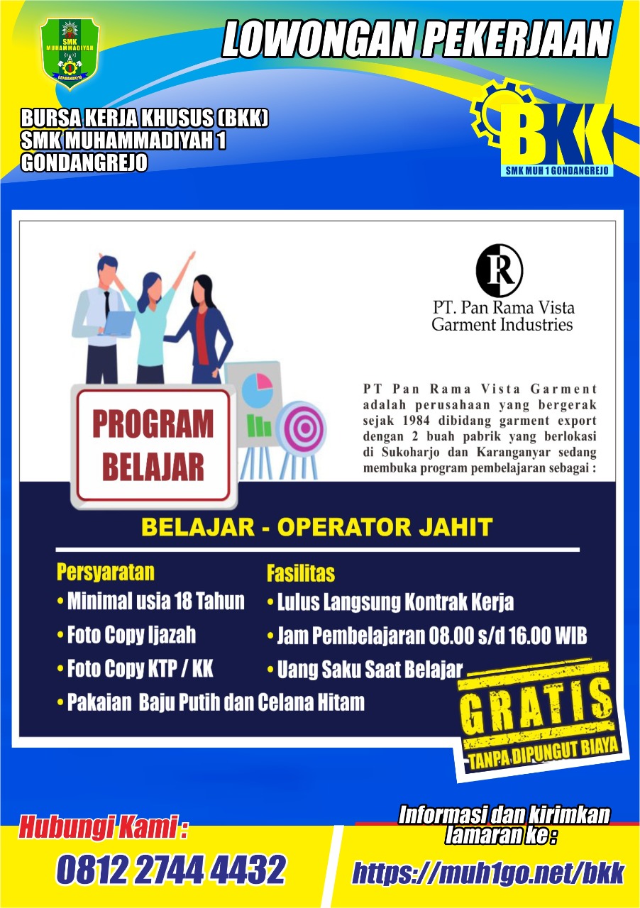 Merupakan perusahaan Garment Export yang berlokasi di sukoharjo dan karanganyar, tepatnya di Desa pinggir Rt 04 Rw 07, Telukan, Grogol, Sukoharjo, Jawa Tengah,57552 dan Jl. Raya Solo Purwodadi km 8,5 Rt 003/Rw007, Mundu,desa Selokaton,kec. Gondang Rejo, kab. Karanganyar, Jawa Tengah membuka program :