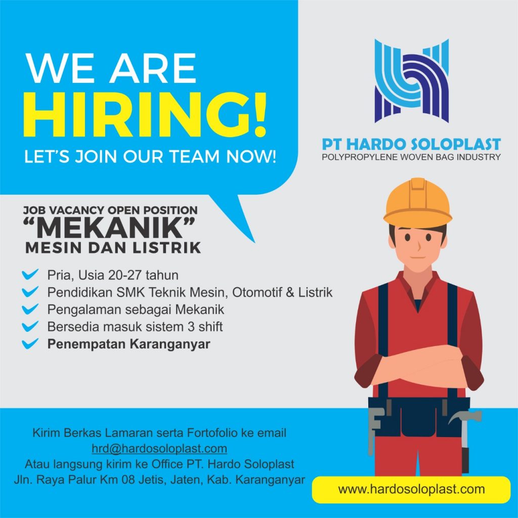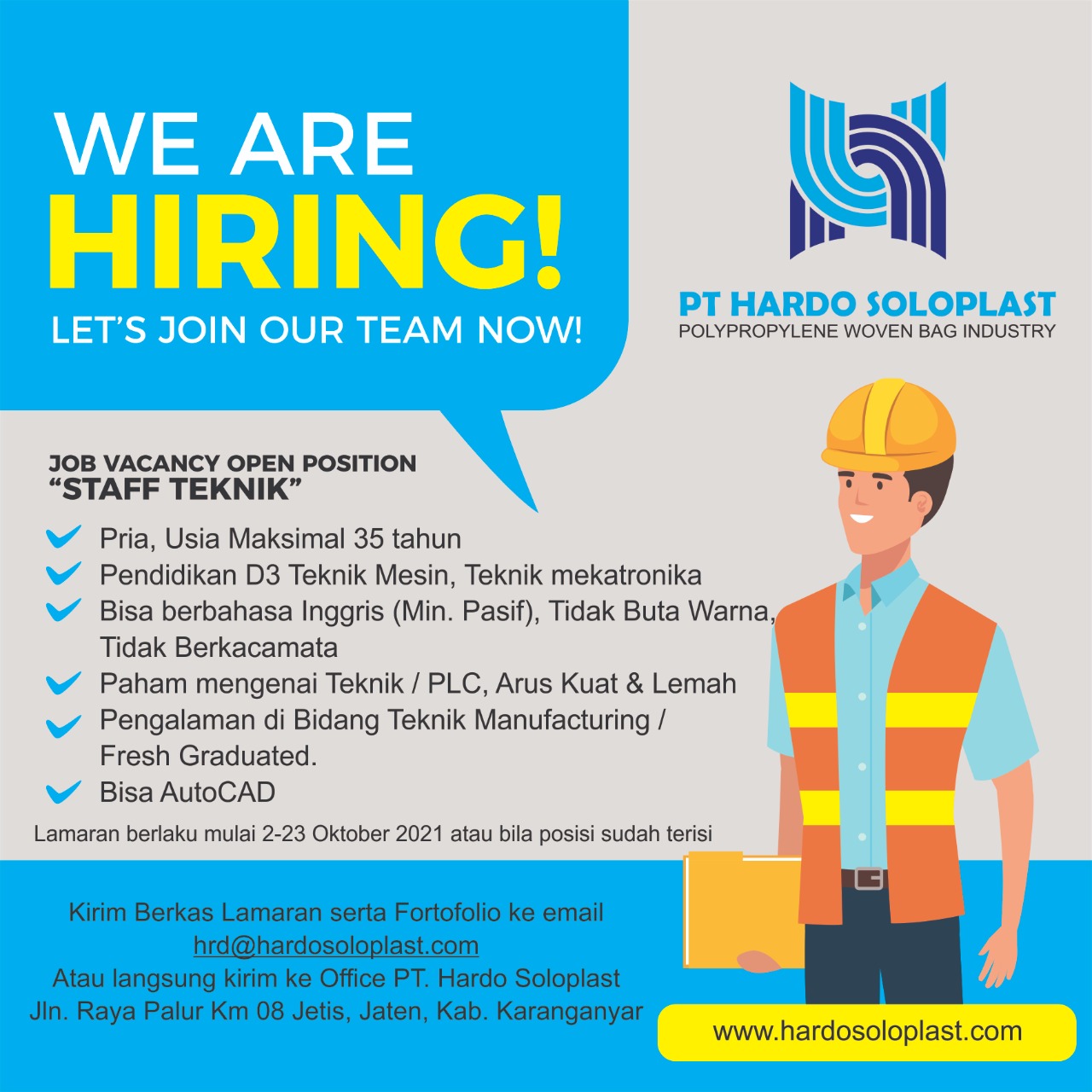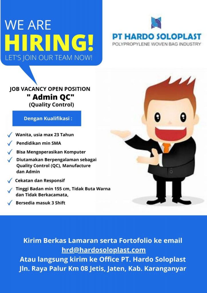 PT Hardo Soloplast didirikan pada tahun 1989 dengan tujuan untuk menjadi pemimpin dalam industri karung Polypropylene. Merupakan salah satu produsen karung PP & benang multifilamen terkemuka di Indonesia. mengundang saudara untuk bergabung pada posisi :