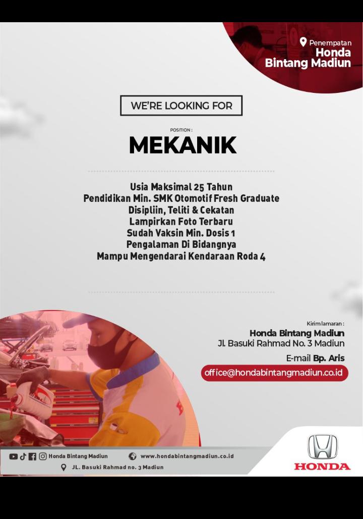 Honda Bintang Madiun adalah salah satu dealer resmi mobil Honda di wilayah karesidenan Madiun yang meliputi Madiun, Magetan, Caruban, Ponorogo, Ngawi & Pacitan menawarkan transaksi jual beli mobil Honda, service mobil Honda, jual beli sparepart genuine mobil Honda dan layanan body repair yang terpercaya. Membutuhkan