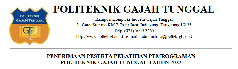 Program Pelatihan Pemrograman merupakan salah satu program pelatihan kerja yang dilakukan di Politeknik Gajah Tunggal dengan masa pembelajaran selama 1 (satu) tahun. Program ini bertujuan untuk mencetak tenaga-tenaga ahli dalam kemampuan pemrograman yang unggul dan siap kerja. Pada tahun 2022 Politeknik Gajah Tunggal membuka pendaftaran peserta baru untuk program pemrograman yang dapat diikuti oleh peserta baik lulusan SMK, DIII, maupun S1. Lulusan dari program pelatihan ini akan langsung ditempatkan kerja di perusahaan yang bekerjasama dengan Politeknik Gajah Tunggal. Adapun materi yang akan diberikan dalam program ini adalah :