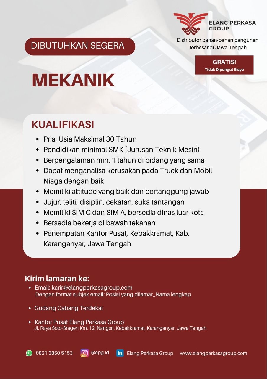 Selama lebih dari 25 tahun, Elang Perkasa Group melayani distribusi bahan bangunan di daerah Jawa Tengah melalui pusatnya di Kebakkramat, Karanganyar, Jawa Tengah. PT Elang Perkasa Group yang beralamatkan Jl. Solo – Sragen No.KM.12, Kebak Jetis, Nangsri, Kec. Kebakkramat, Kabupaten Karanganyar, Jawa Tengah 57762, membutuhkan: