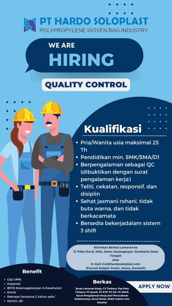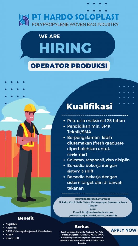 PT Hardo Soloplast didirikan pada tahun 1989 dengan tujuan untuk menjadi pemimpin dalam industri karung Polypropylene. Merupakan salah satu produsen karung PP & benang multifilamen terkemuka di Indonesia. mengundang saudara untuk bergabung pada posisi :
