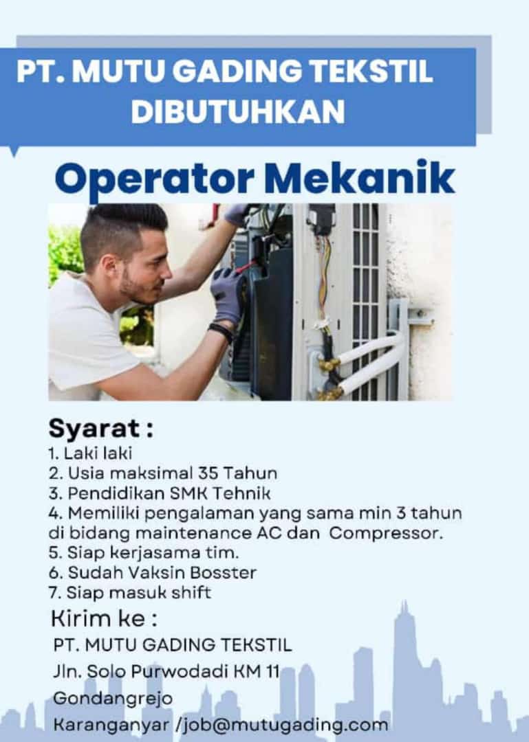 PT. Mutu Gading Tekstil adalah salah satu perusahaan manufaktur benang dengan pertumbuhan tercepat di Indonesia dengan kapasitas tahunan memproduksi 50.000 ton Benang Bertekstur Poliester (PTY). Kami adalah ISO 9001:2015, ISO 14001:2015, ISO 45001:2018, STANDARD 100 oleh OEKO-TEX®, REACH dan 100% GRS (Global Recycle Standard) perusahaan bersertifikat yang, dalam waktu singkat sejak didirikan pada tahun 1997, berkembang menjadi salah satu pemain terkemuka di industri poliester.Membutuhkan karyawan pada posisi :