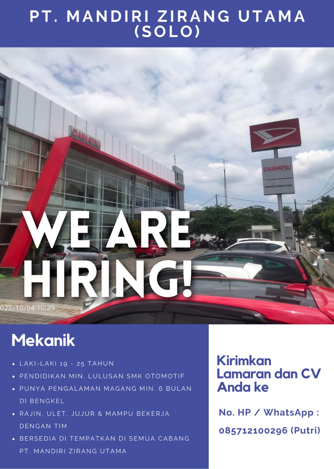Mandiri Zirang Utama Daihatsu Solo merupakan dealer resmi Daihatsu yang berada di Jl. Ir.Sutami No. 14, Jebres, Jebres, Surakarta, Jawa Tengah, 57126, membuka kesempatan bagi anda untuk bergabung pada posisi :