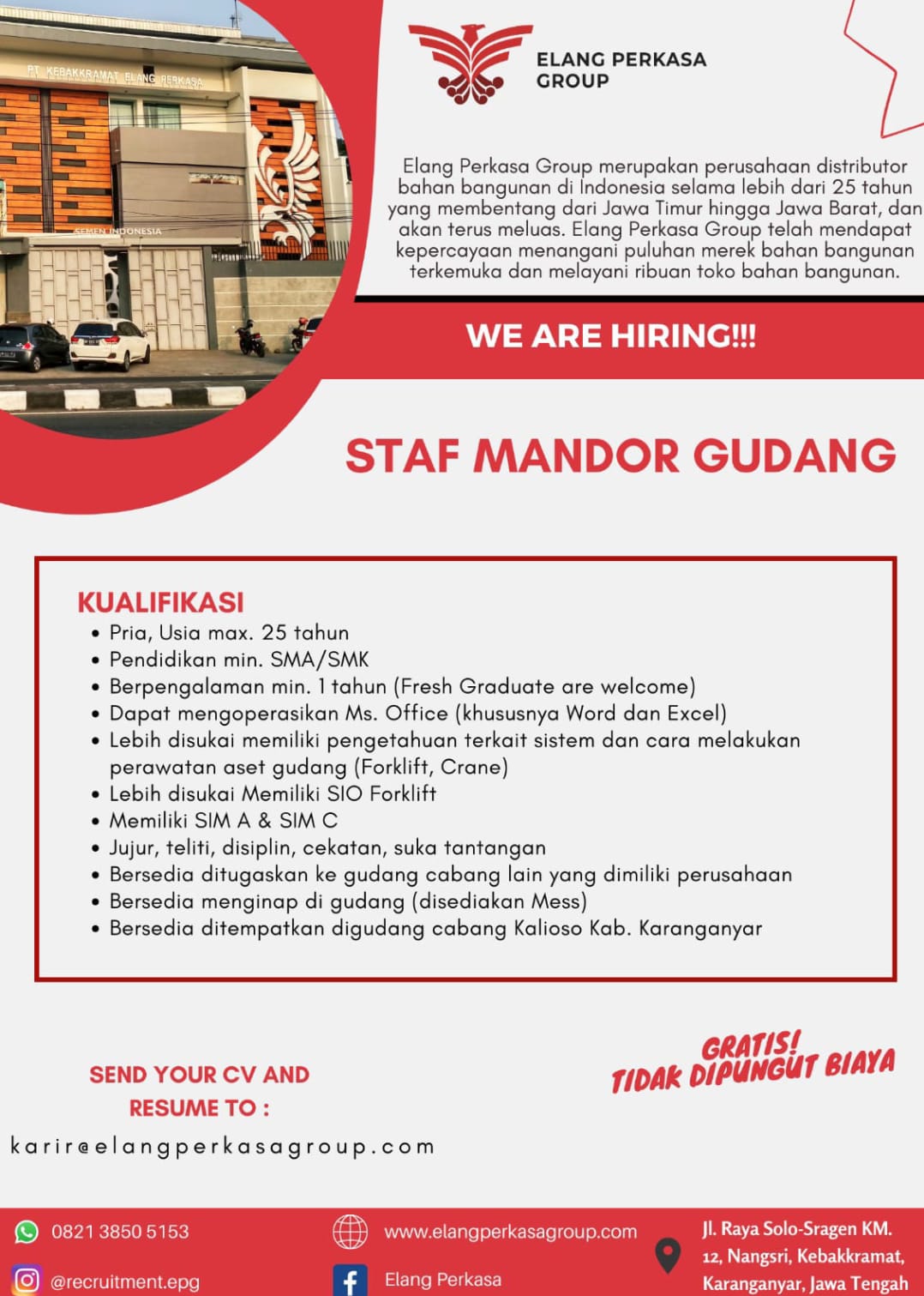 Selama lebih dari 25 tahun, Elang Perkasa Group melayani distribusi bahan bangunan di daerah Jawa Tengah melalui pusatnya di Kebakkramat, Karanganyar, Jawa Tengah. PT Elang Perkasa Group yang beralamatkan Jl. Solo – Sragen No.KM.12, Kebak Jetis, Nangsri, Kec. Kebakkramat, Kabupaten Karanganyar, Jawa Tengah 57762, membutuhkan: