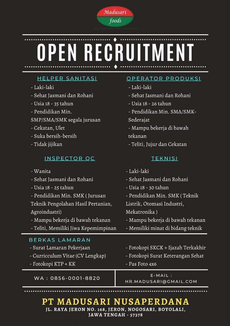 PT. Madusari Nusaperdana sejak awal berdiri senantiasa berkomitmen untuk menyediakan beragam produk pangan daging olahan yang bernilai tambah, bernutrisi, terjangkau, sekaligus membuka lapangan pekerjaan di Indonesia. Perusahaan terus tumbuh dan berkembang untuk melayani kebutuhan konsumen melalui beragam produk andalan yang dipasarkan dengan merek dagang KIMBO, VIGO, dan FINO. PT. Madusari Nusaperdana membuka lowongan pekerjaan bagi anda untuk bergabung pada posisi :