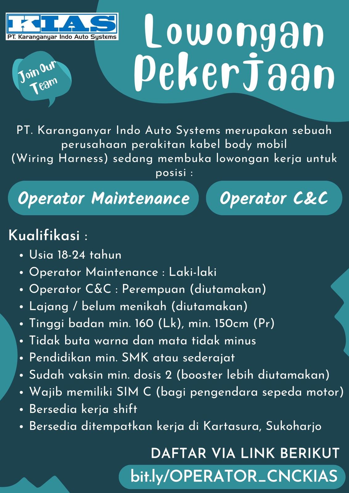 PT. KARANGANYAR INDO AUTO SYSTEMS (KIAS) yang beralamatkan di Bulu RT.02 RW.05, Desa Jaten, Kecamatan Jaten, Kabupaten Karanganyar, Jawa tengah, 57771 Indonesia yang bergerak dalam bidang Sparepart kendaraan bermotor khususnya mobil yang sedang berkembang dengan pesat membutuhkan banyak Karyawan/Karyawati yang terampil dan mempunyai komitmen tinggi dalam bekerja.