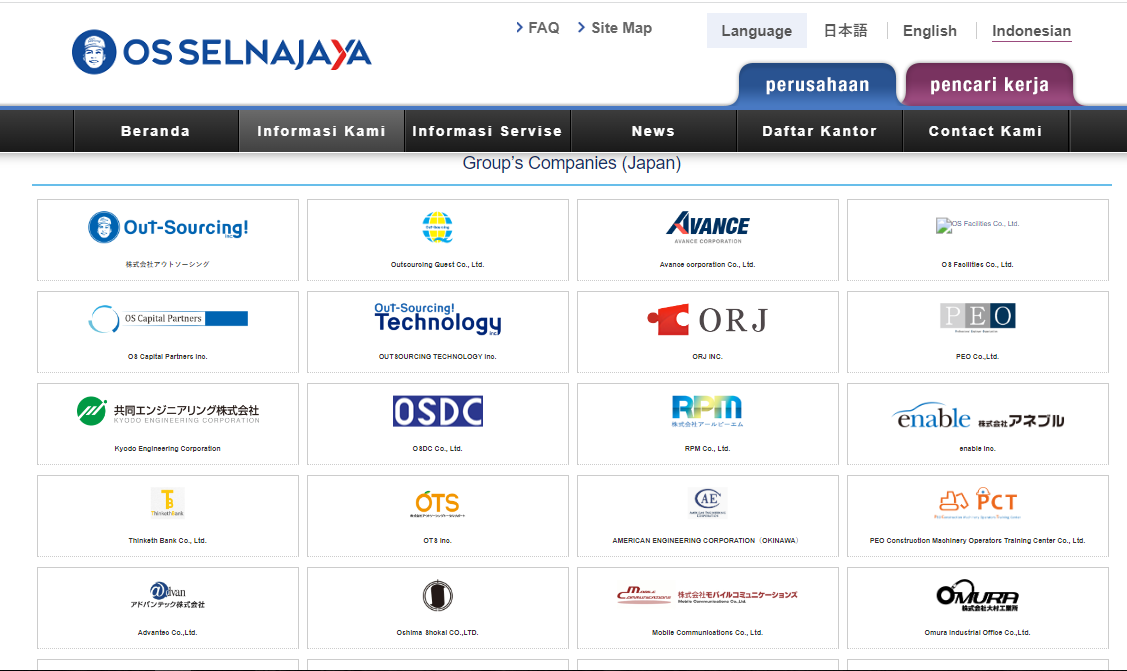 PT OS Selnajaya Indonesia adalah salah satu di antara grup internasional Outsorcing Inc. (Kantor Pusat, Tokyo yang tercatat dalam Bursa Efek Tokyo) yang mengembangkan jasa terkait human resource secara komprehensif. PT. OS menyediakan jasa dalam ruang lingkup yang luas, terutama human resource, legal dan pendidikan untuk mencari solusi tepat dalam segala masalah dan untuk efisiensi dalam pengurusan dan administrasi rumit yang dihadapi perusahaan Jepang yang ada di Indonesia.