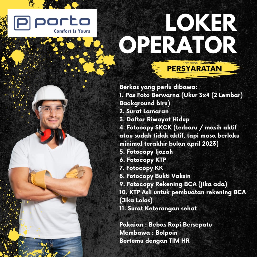 PT Porto Indonesia Sejahtera adalah perusahaan manufaktur yang berfokus pada produk alas kaki. Porto menawarkan berbagai jenis produk alas kaki dari sandal hingga sepatu, baik bagi pria maupun wanita. Bahkan ada juga produk untuk anak-anak. PT Porto Indonesia Sejahtera dikenal dengan brand premium Porto dengan desain yang futuristik dan tekonologi lightweight. PT. PORTO INDONESIA SEJAHTERA berpusat di Jakarta Utara, saat ini sedang mengembangkan bisnisnya dan membuka pabrik baru di Kabupaten Karanganyar, Jawa Tengah yang berlamat di Jalan Raya Solo-Sragen, km 10, Sroyo, Jaten, Sulingan, Kemiri, Kec, Kec. Kebakkramat, Jawa Tengah, 57762. Membuka lowongan bagi anda dengan persyaratan