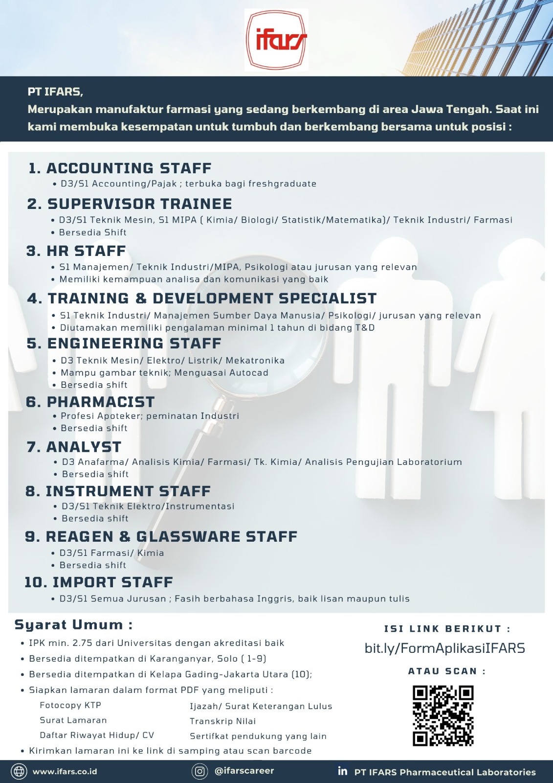 PT IFARS Pharmaceutical Laboratories, perusahaan yang bergerak dibidang manufaktur farmasi. Seiring dengan perkembangan perusahaan, saat ini  membuka lowongan pekerjaan untuk posisi :