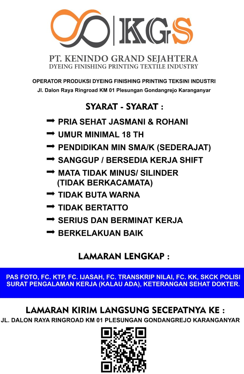 PT Kenindo Grand Sejahtera membuka kesempatan bagi anda lulusan SMP/MTs maupun SMA/SMK untuk bekerja di perusahaan yang bergerak dibidang tekstile. perusahaan Kenindo Grand Sejahtera beralamatkan Ingasrejo, Plesungan, Kec. Gondangrejo, Kabupaten Karanganyar, Jawa Tengah 57181 membuka lowongan kerja pada posisi