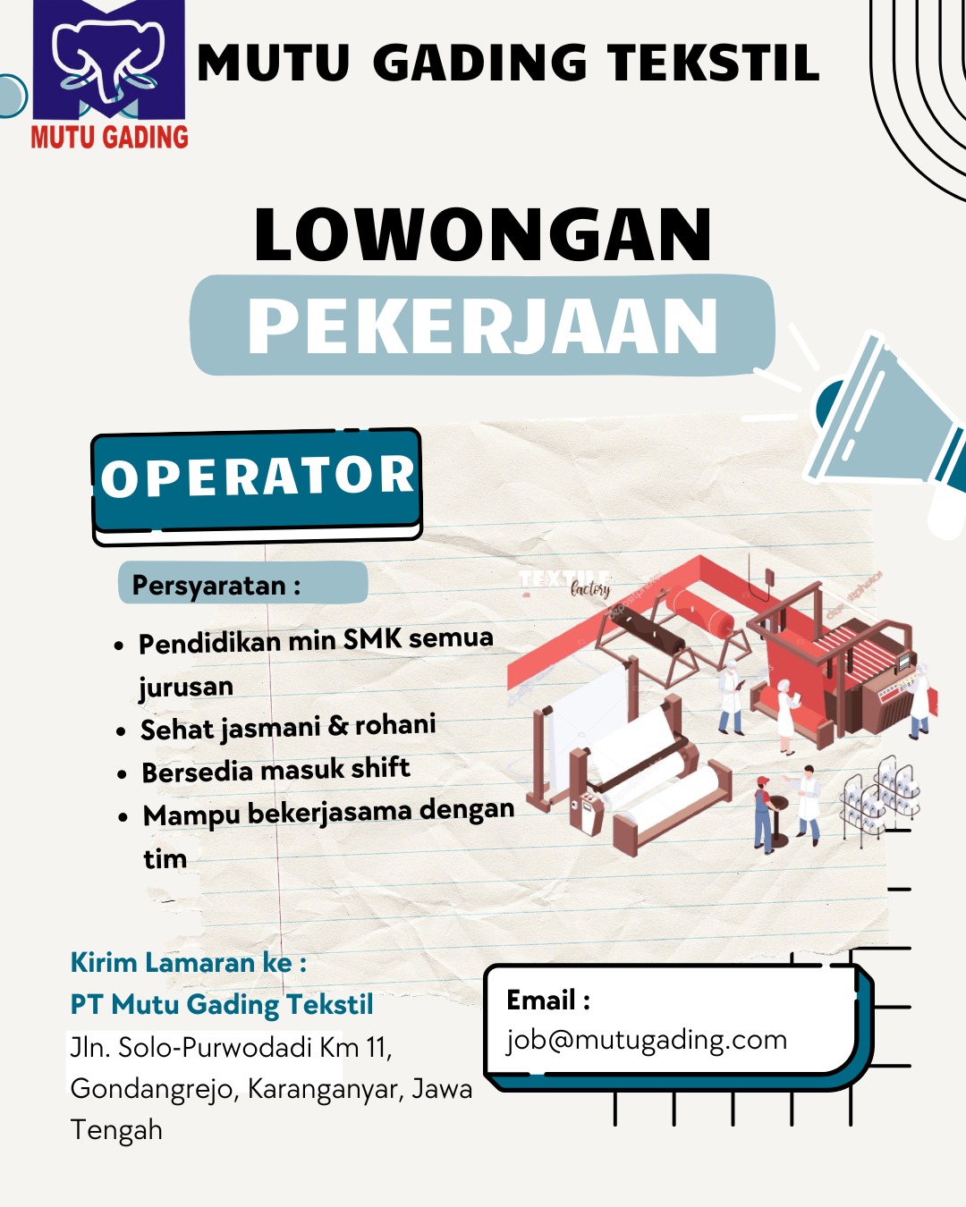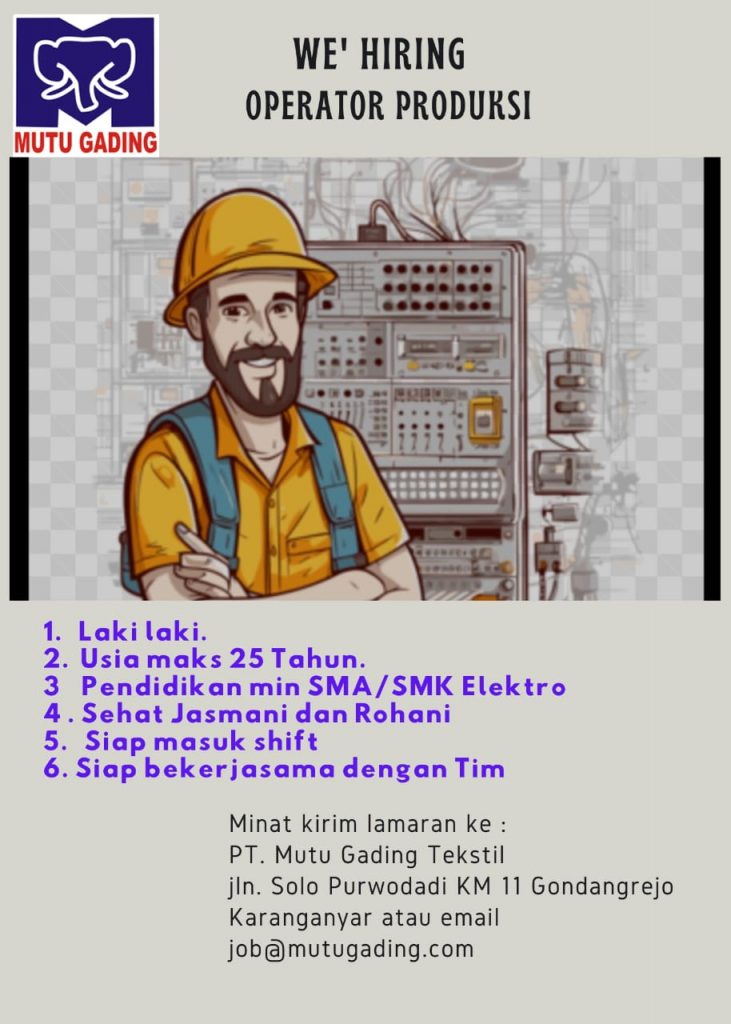 Di PT. Mutu Gading Tekstil, kami lebih dari sekedar perusahaan manufaktur benang; kami adalah perwujudan keunggulan, keberlanjutan, dan inovasi dalam industri tekstil Indonesia. Didirikan pada tahun 1997, perjalanan kami dari awal yang sederhana hingga menjadi salah satu produsen benang dengan pertumbuhan tercepat di Indonesia merupakan bukti komitmen teguh kami terhadap kualitas dan kemajuan. membuka lowongan pada posisi