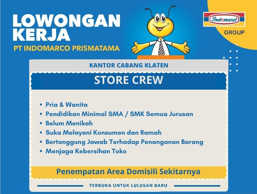 PT. Indomarco Prismatama yang dikenal dengan nama-nama seperti Indomaret, Indogrosir dan lain sebagaianya membuka lowongan pekerjaan dengan formasi sebagai: