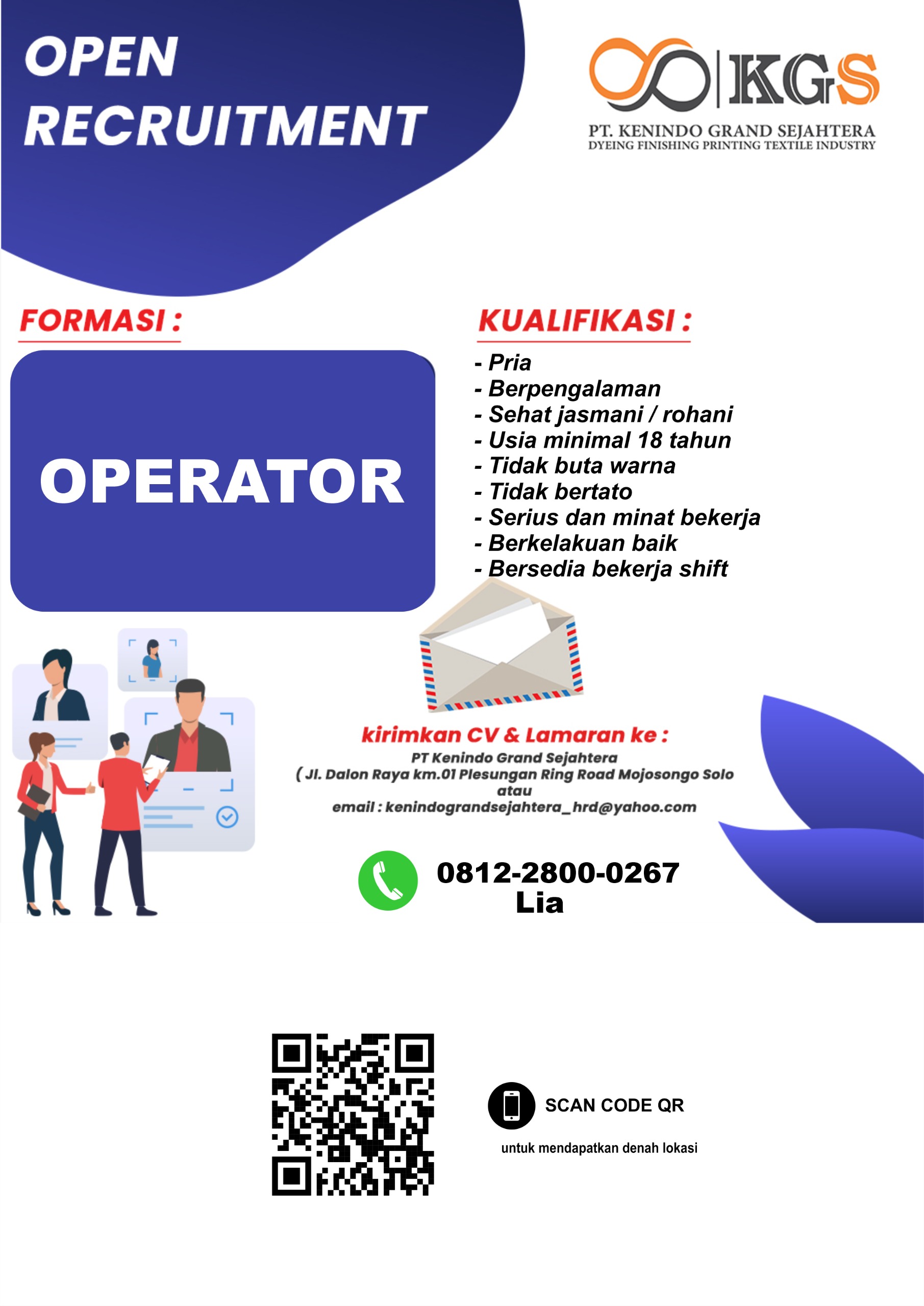 PT Kenindo Grand Sejahtera membuka kesempatan bagi anda lulusan SMP/MTs maupun SMA/SMK untuk bekerja di perusahaan yang bergerak dibidang tekstile. perusahaan Kenindo Grand Sejahtera beralamatkan Ingasrejo, Plesungan, Kec. Gondangrejo, Kabupaten Karanganyar, Jawa Tengah 57181 membuka lowongan kerja pada posisi