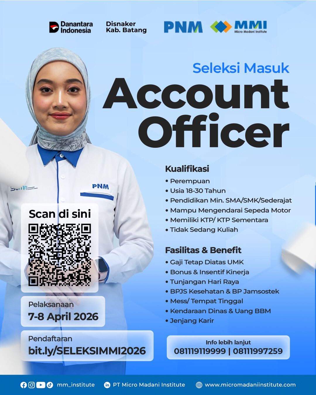 PNM Micro Madani Institute bekerja sama dengan Danantara Indonesia dan Disnaker Kabupaten Batang membuka kesempatan bagi kandidat terbaik untuk bergabung sebagai Account Officer. Posisi ini ditujukan bagi lulusan SMA/SMK yang ingin memiliki karir di bidang pembiayaan dan pemberdayaan masyarakat.