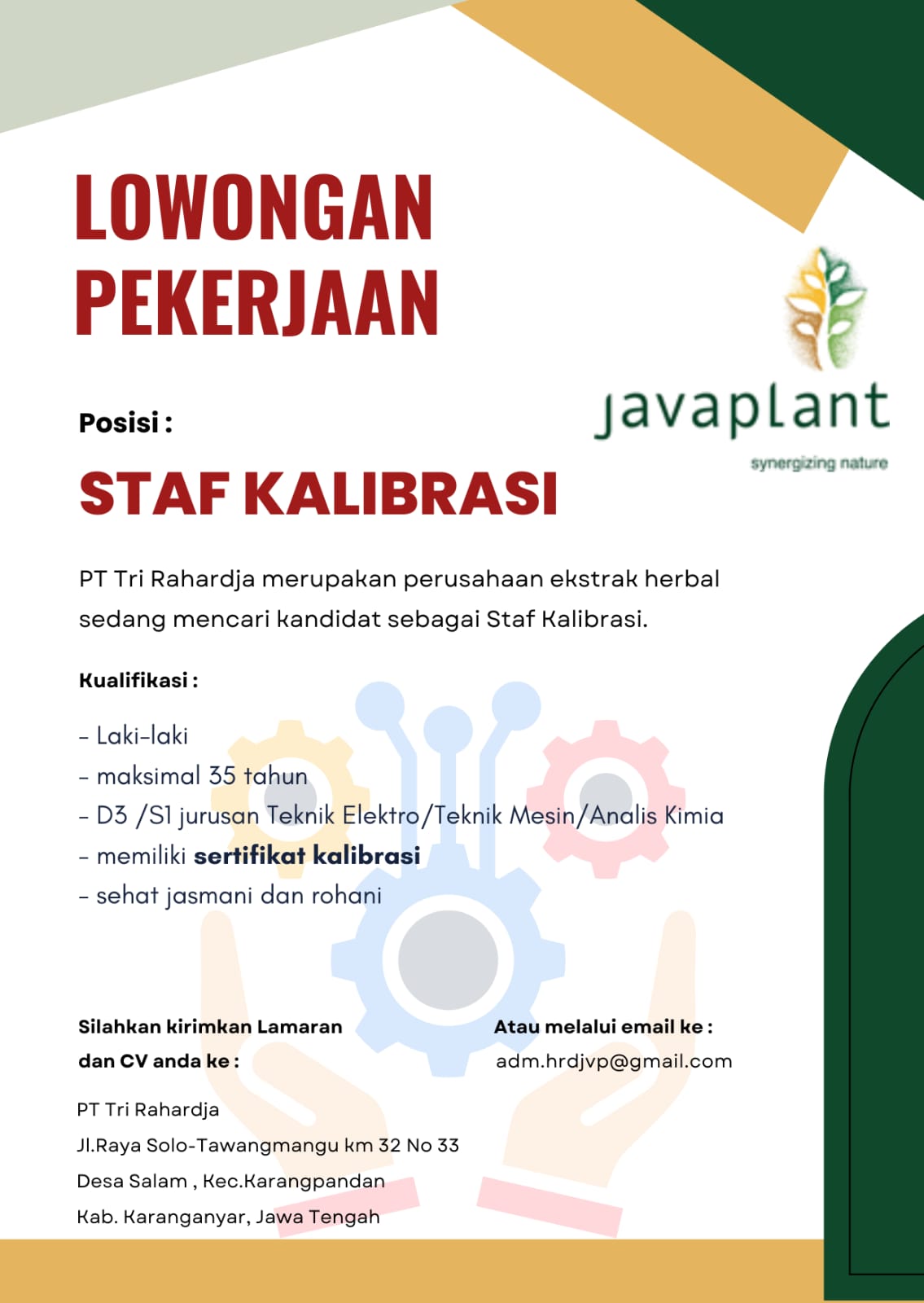 PT Tri Rahardja (Javaplant), perusahaan yang bergerak di bidang ekstrak herbal, saat ini membuka kesempatan bagi kandidat terbaik untuk bergabung sebagai Staf Kalibrasi.